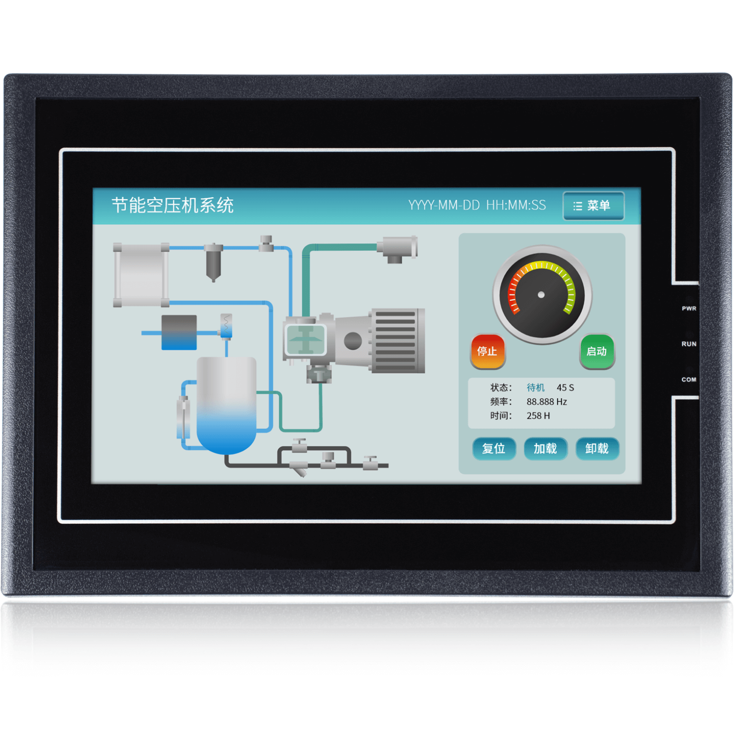金璽HMI應用在超聲波控制上,安裝在控制機箱上對超聲波進行數據設定和監控。